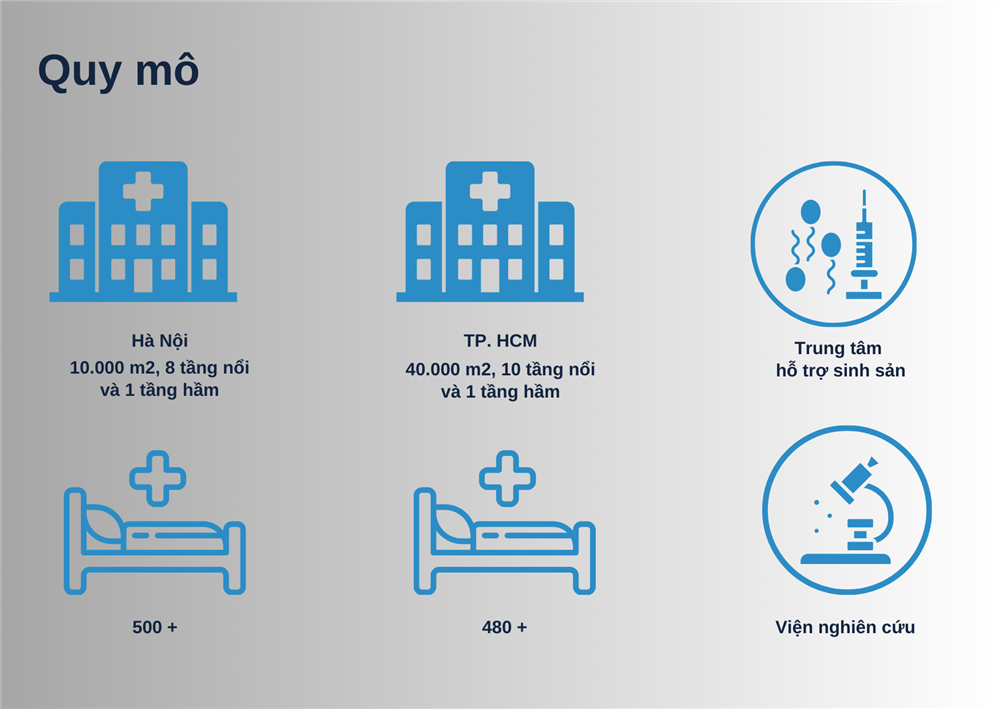 Mỗi cơ sở đều được thiết kế theo tiêu chuẩn quốc tế, đảm bảo cung cấp môi trường điều trị thoải mái và an toàn cho bệnh nhân, và có quy mô lớn với tổng số giường bệnh lên tới: