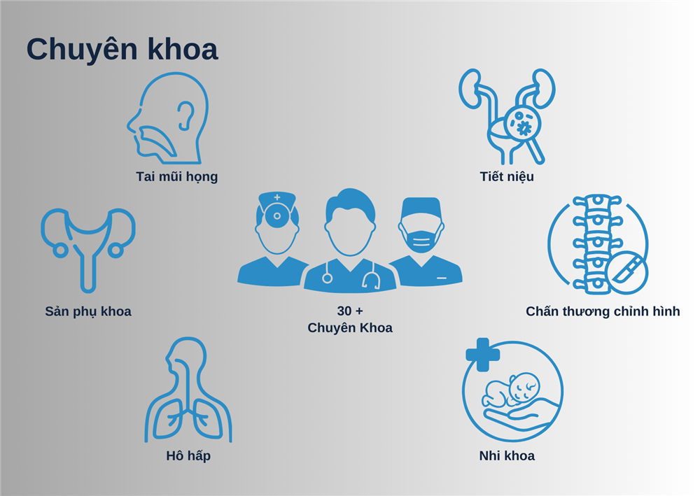 - Ngoại khoa: Phẫu thuật tổng quát, phẫu thuật tiêu hóa, phẫu thuật gan mật, phẫu thuật thần kinh, phẫu thuật tim mạch, phẫu thuật chấn thương chỉnh hình.