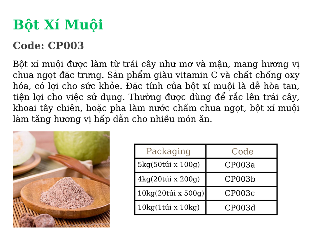 Như vậy, bột xí muội không chỉ là một thành phần ẩm thực mà còn là một sản phẩm chiến lược trong lĩnh vực sourcing, đem lại giá trị gia tăng cho ngành công nghiệp thực phẩm và mang đến cho người tiêu dùng một lựa chọn ẩm thực đa dạng và bổ ích.