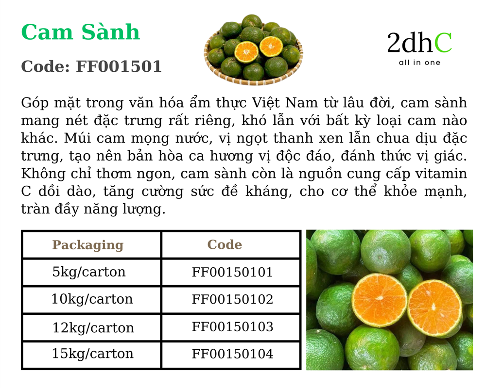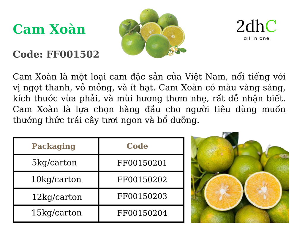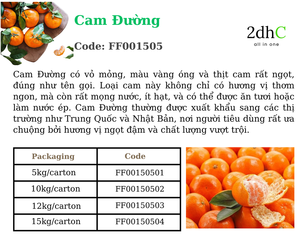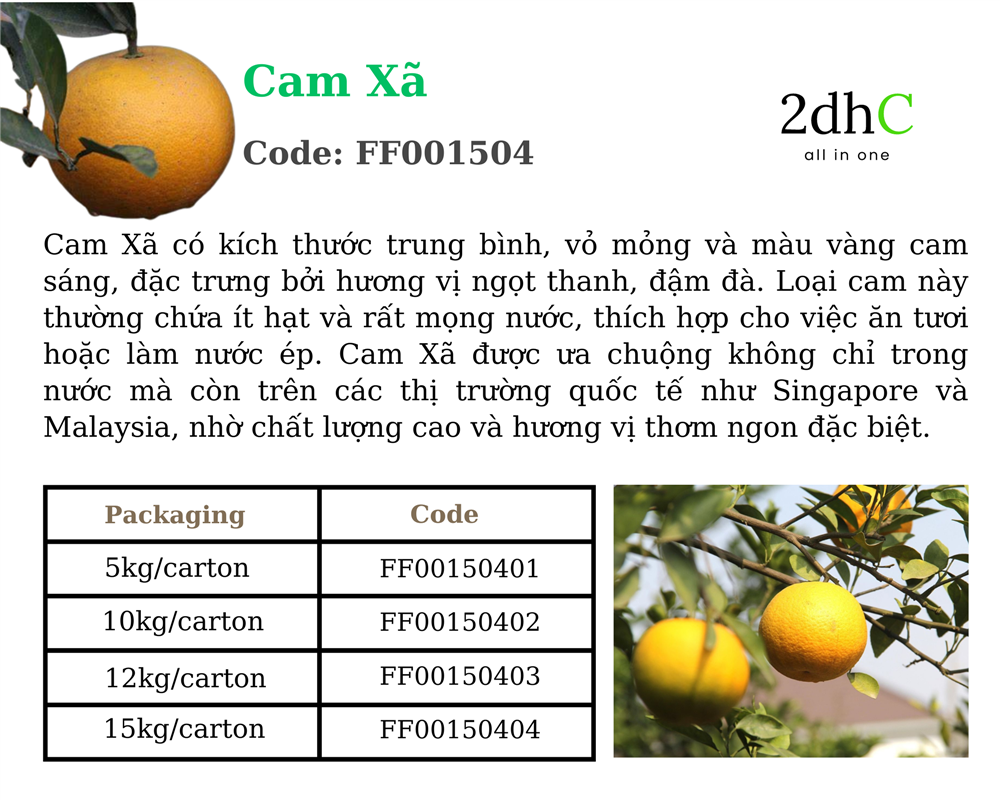 Với vai trò là một đại lý cung ứng uy tín, 2dhC đóng vai trò quan trọng trong việc kết nối doanh nghiệp với các nhà cung cấp cam chất lượng từ những vùng trồng cam nổi tiếng. 2dhC cam kết đảm bảo quy trình sản xuất và chế biến đạt tiêu chuẩn quốc tế, hỗ trợ các doanh nghiệp trong và ngoài nước tìm kiếm sản phẩm cam phù hợp với nhu cầu thị trường. Nhờ vào mạng lưới đối tác rộng lớn và kinh nghiệm dày dạn, 2dhC cung cấp các giải pháp tối ưu cho việc lựa chọn, nhập khẩu và kinh doanh cam, đảm bảo lợi ích lâu dài và an toàn trong các giao dịch thương mại.