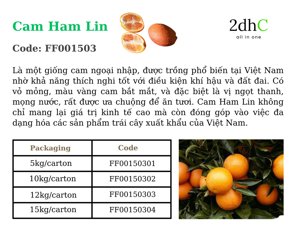 - Cam Ham Lin: Cam Ham Lin có vỏ mỏng và màu sắc tươi sáng, cùng với vị ngọt và hương thơm đặc trưng. Loại cam này thường được trồng ở các tỉnh miền Tây Nam Bộ như Bến Tre và Trà Vinh. Cam Ham Lin chủ yếu được xuất khẩu sang các thị trường Nhật Bản, Hàn Quốc và Trung Quốc, nơi có nhu cầu cao về cam chất lượng cao và ngon miệng.