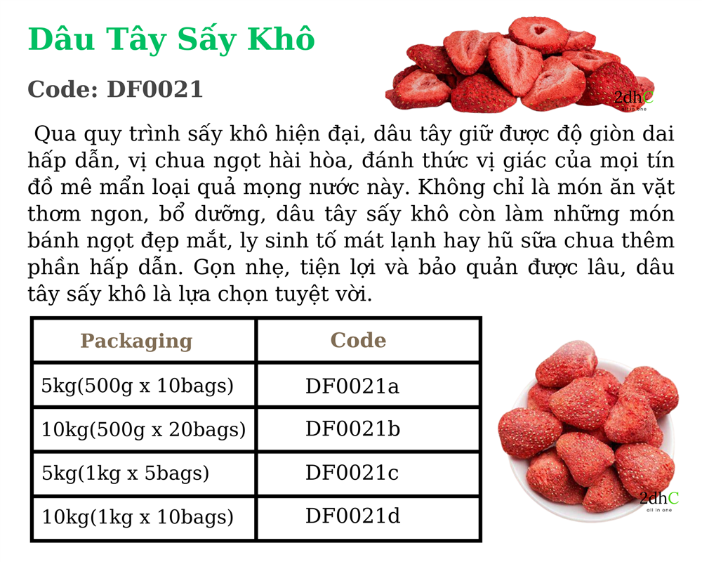 2dhC tự hào là cầu nối uy tín, đồng hành cùng các doanh nghiệp Việt Nam đưa sản phẩm dâu tây sấy khô chất lượng cao vươn ra thị trường quốc tế. Chúng tôi cung cấp giải pháp toàn diện, từ khâu kết nối nhà sản xuất, kiểm soát chất lượng, xây dựng thương hiệu đến xúc tiến thương mại, giúp doanh nghiệp tiếp cận khách hàng tiềm năng trên toàn cầu.
