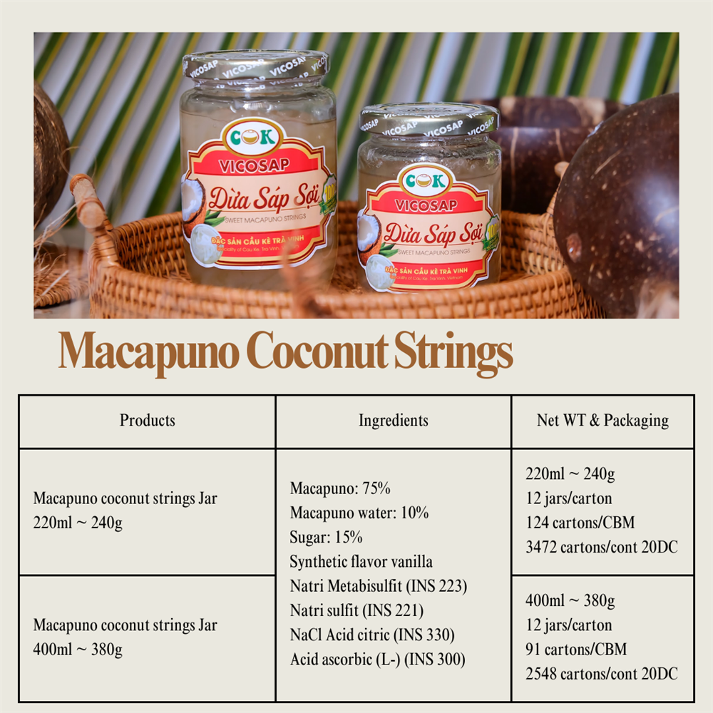 Trong vai trò Đại diện Tìm nguồn Liên kết uy tín, 2dhC tự hào giới thiệu đến các đối tác quốc tế tại Philippines, Hoa Kỳ, Châu Âu, Nhật Bản, Hàn Quốc và nhiều thị trường khác một kho báu ẩm thực độc đáo của Việt Nam - Dừa Sáp Sợi Trà Vinh.