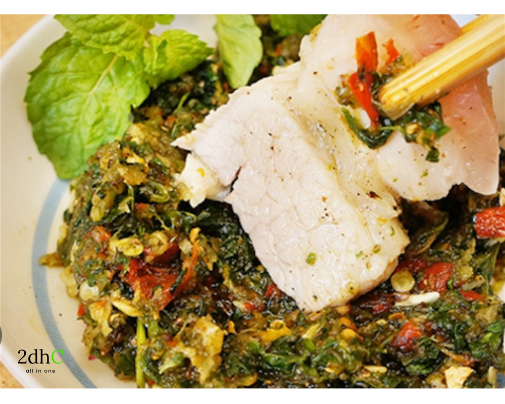 Chấm chéo hạt dổi: Chẩm chéo là món nước chấm nổi tiếng của người Thái, được làm từ hạt dổi, mắc khén, tỏi, ớt và các loại rau thơm. Chẩm chéo thường được dùng để chấm cùng thịt nướng, cá nướng hoặc rau luộc. Hạt dổi giã nhỏ hòa quyện với các nguyên liệu khác, tạo nên vị cay thơm nồng, kích thích vị giác, làm tăng thêm hương vị cho các món ăn kèm.
