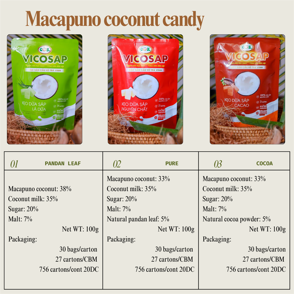 - Kẹo dừa sáp vị cacao: Hòa quyện giữa hương chocolate đậm đà và dừa sáp thơm béo