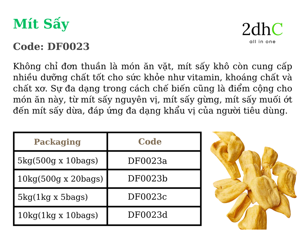 Với vai trò chủ động, tích cực trong việc kiểm soát chất lượng throughout chuỗi cung ứng, 2dhC góp phần nâng cao giá trị cho sản phẩm mít sấy khô Việt Nam, mang đến cho người tiêu dùng sản phẩm chất lượng, an toàn và tốt cho sức khỏe.