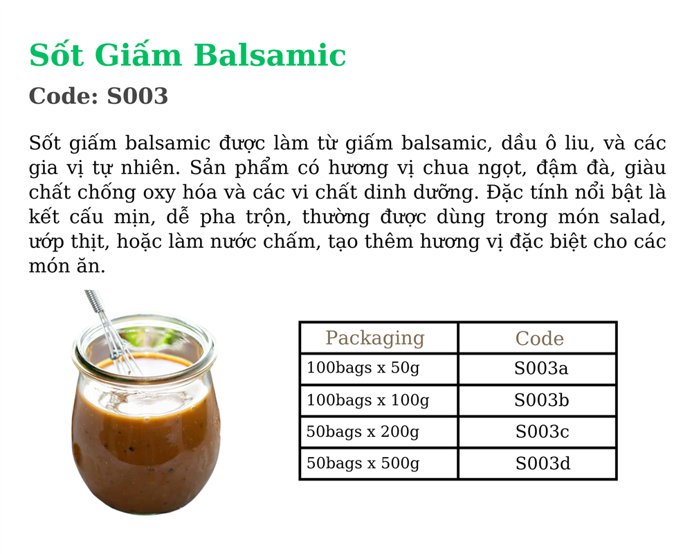 - Thế Giới: Sốt giấm Balsamic đã chinh phục thực khách toàn cầu bởi hương vị tinh tế, độc đáo. Từ món ăn đường phố đến bàn tiệc sang trọng, sốt giấm Balsamic luôn là lựa chọn hàng đầu của các đầu bếp nổi tiếng.