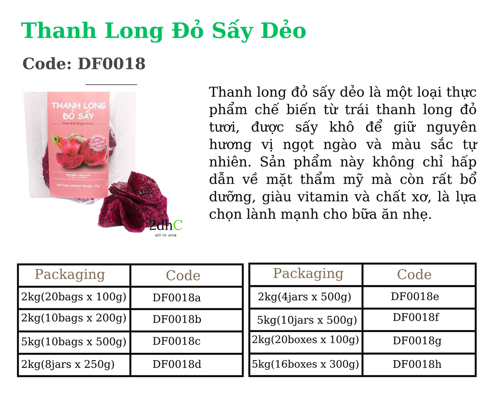 Với sự cam kết của 2dhC trong việc đảm bảo chất lượng và an toàn thực phẩm, sản phẩm thanh long đỏ sấy dẻo không chỉ đáp ứng nhu cầu của thị trường nội địa mà còn được xuất khẩu ra nhiều quốc gia, góp phần quảng bá hương vị đặc sắc của Việt Nam ra thế giới.