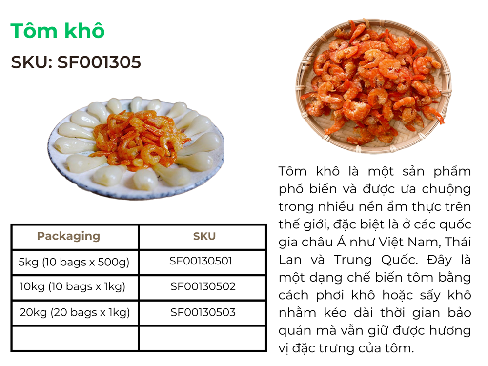 - Tôm khô: Tôm được phơi hoặc sấy khô, giữ nguyên hương vị tự nhiên.
