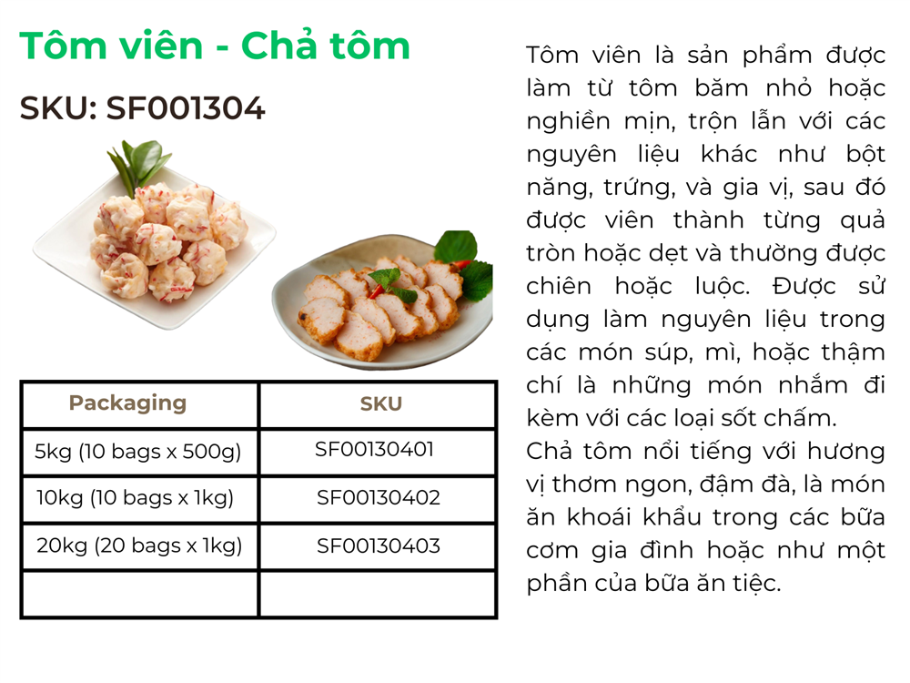 - Tôm viên, Chả Tôm: Tôm được xay nhuyễn, trộn với gia vị và các thành phần khác, sau đó làm thành viên hoặc bánh - thường dùng trong các món súp, lẩu.
