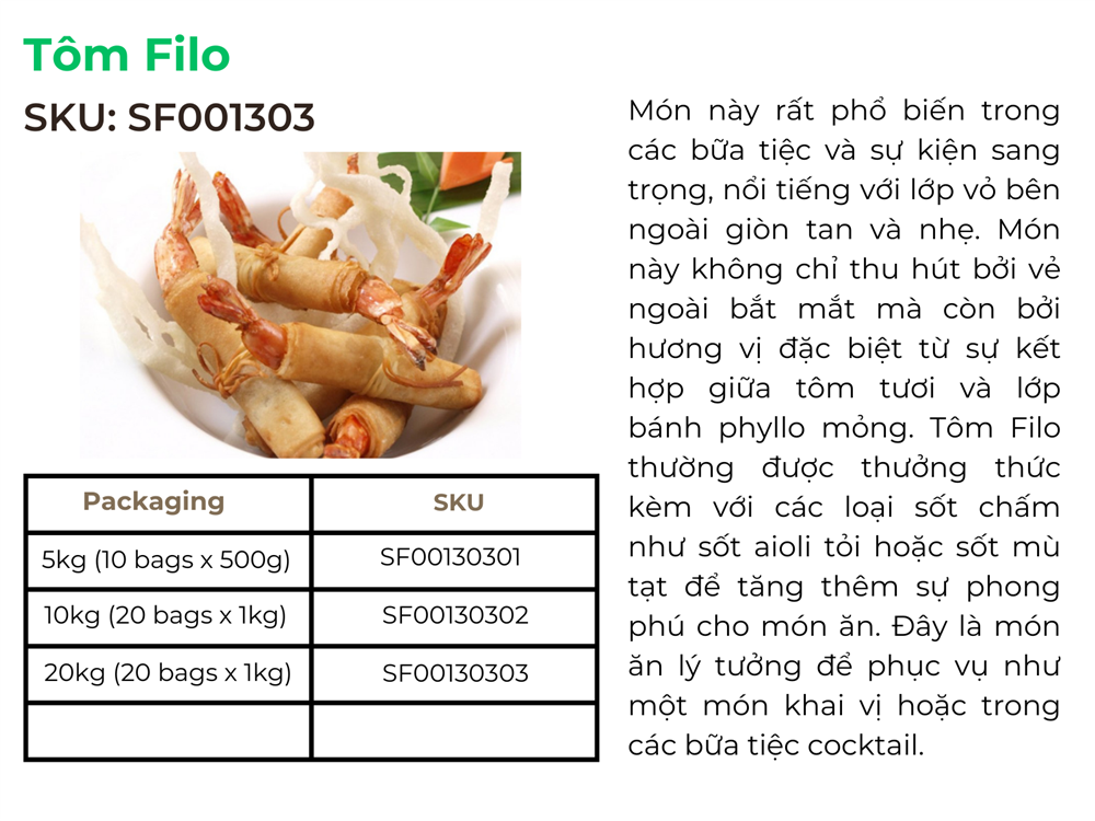 - Tôm Filo: Tôm được làm bằng cách bọc tôm đã được lột vỏ (thường là để lại đuôi) với bột Filo, sau đó chiên đến khi chín vàng giòn.