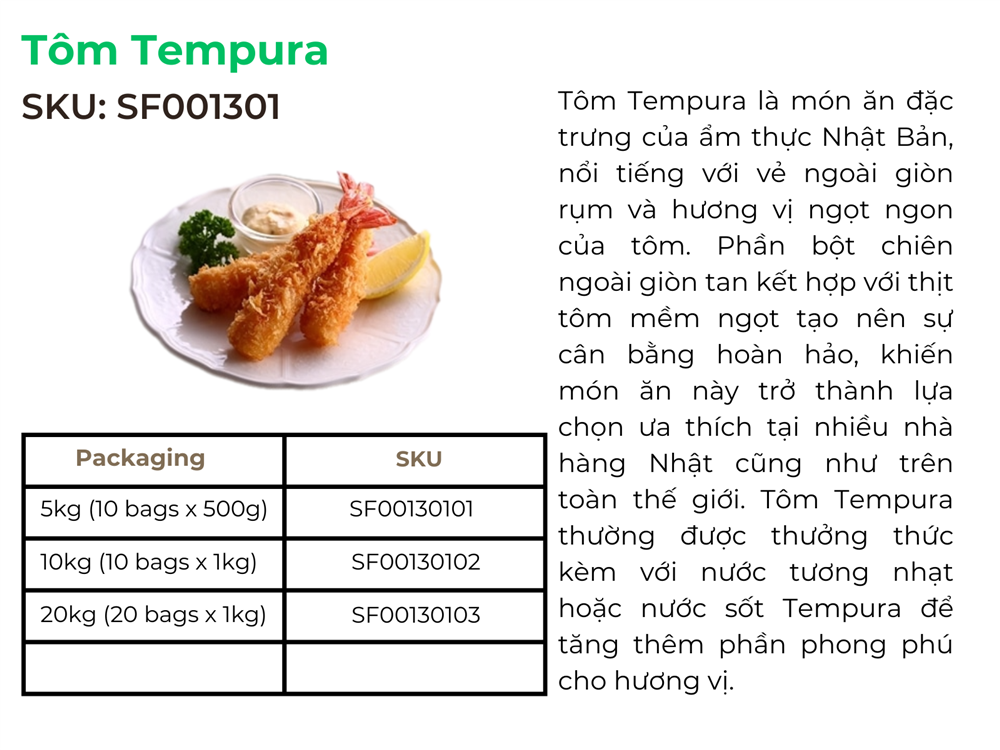 - Tôm Tempura: Tôm chiên giòn, thường dùng trong các món ăn Nhật Bản.