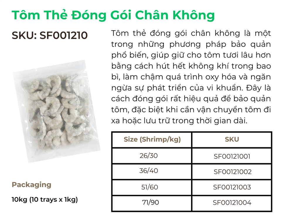 Cách bảo quản: Để giữ cho tôm thẻ tươi ngon, nên bảo quản tôm trong tủ lạnh ở nhiệt độ thấp hoặc đông lạnh nếu muốn giữ lâu hơn. Bao bì hút chân không là phương pháp lý tưởng để bảo quản tôm, giúp tôm giữ được độ tươi ngon và chất lượng tối ưu.