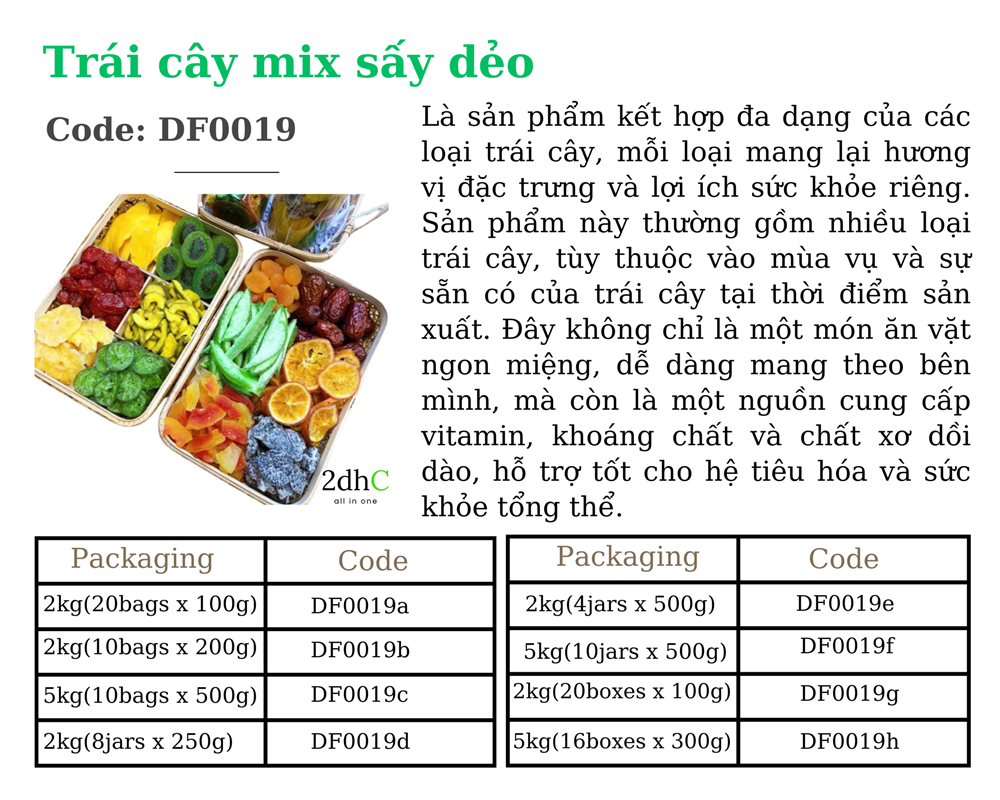 - Phân phối và mở rộng thị trường: 2dhC không chỉ giám sát sản xuất mà còn tích cực mở rộng thị trường, đảm bảo trái cây mix sấy dẻo có mặt trên thị trường trong nước và quốc tế, thúc đẩy sự phát triển bền vững của ngành công nghiệp thực phẩm chế biến Việt Nam.