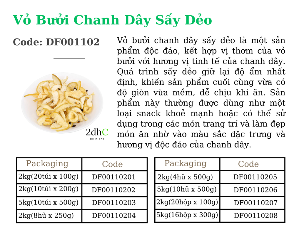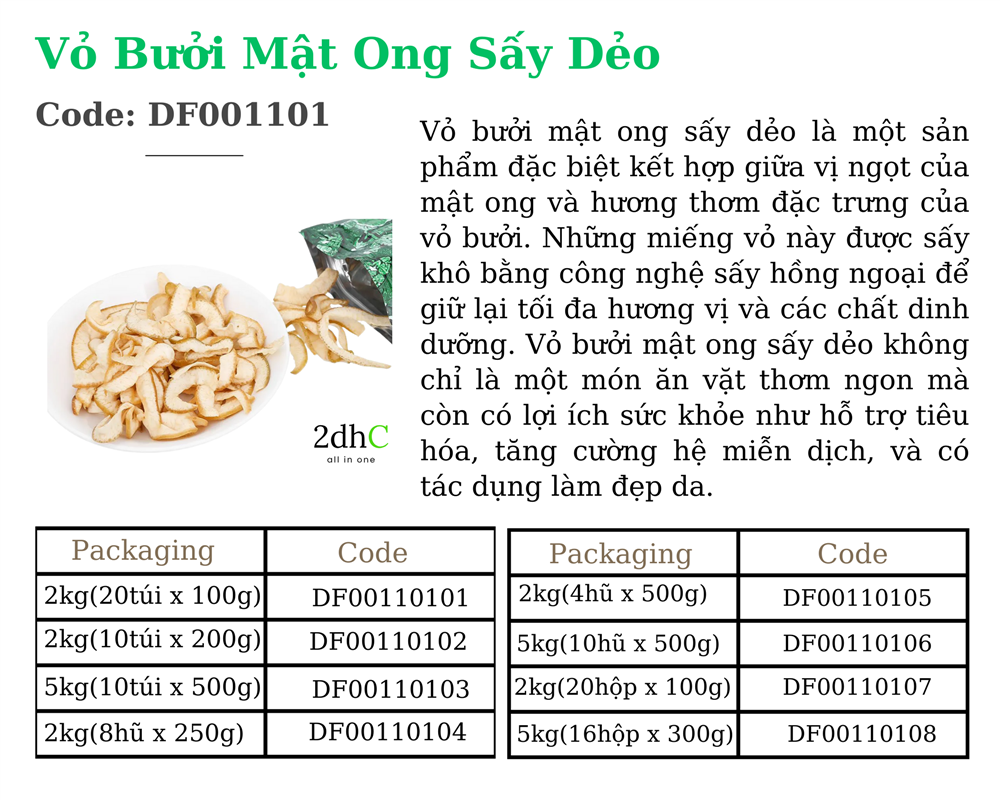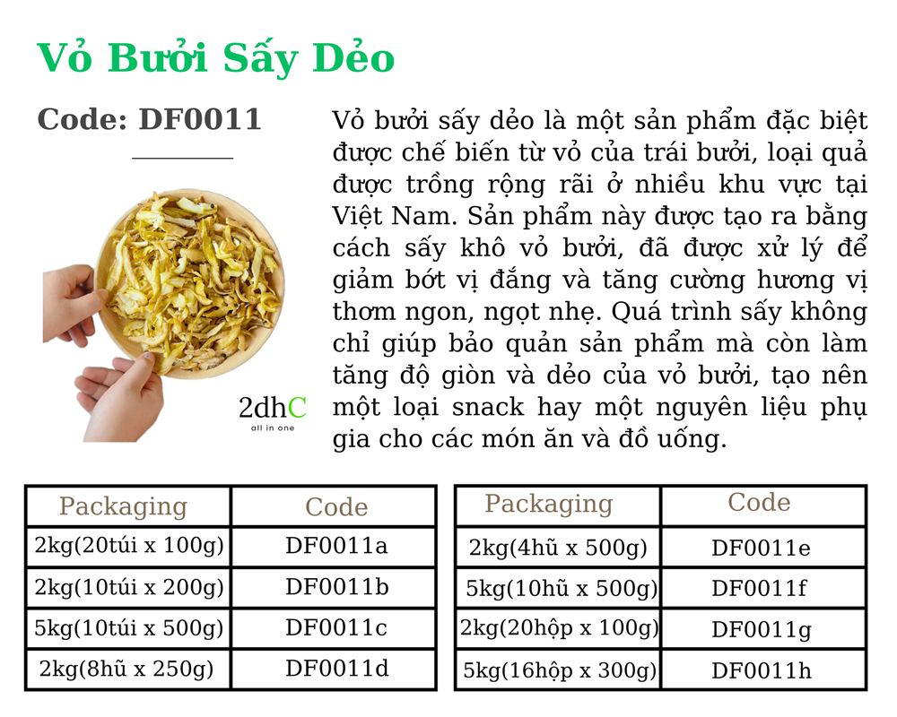 Vai trò 2dhC: 2dhC, như một nhà cung cấp và phân phối, đóng vai trò quan trọng trong việc đảm bảo chất lượng nguồn nguyên liệu và quy trình sản xuất vỏ bưởi sấy dẻo. Công ty cam kết cung cấp sản phẩm đạt chuẩn chất lượng cao, với nguồn gốc rõ ràng và bền vững, giúp khách hàng tiếp cận được với những sản phẩm vỏ bưởi sấy dẻo ngon và chất lượng nhất. 2dhC cũng hỗ trợ trong việc phát triển các thị trường mới và mở rộng khả năng tiếp cận của sản phẩm này trên toàn cầu, qua đó nâng cao giá trị gia tăng cho sản phẩm truyền thống này của Việt Nam.