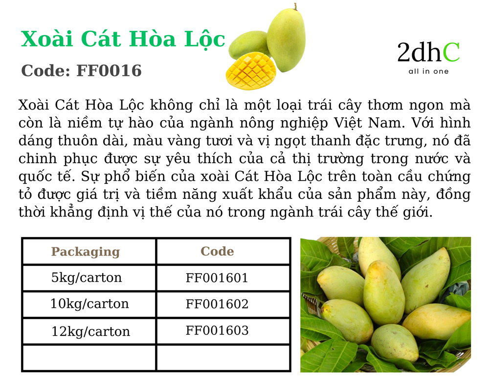 Với vai trò là một đại lý cung ứng uy tín, 2dhC đóng vai trò quan trọng trong việc kết nối doanh nghiệp với các nhà cung cấp xoài Hòa Lộc chất lượng từ các vùng trồng nổi tiếng. 2dhC cam kết đảm bảo quy trình sản xuất và chế biến đạt tiêu chuẩn quốc tế, hỗ trợ các doanh nghiệp trong và ngoài nước tìm kiếm sản phẩm xoài Hòa Lộc phù hợp với nhu cầu thị trường. Nhờ vào mạng lưới đối tác rộng lớn và kinh nghiệm dày dạn, 2dhC cung cấp các giải pháp tối ưu cho việc lựa chọn, nhập khẩu và kinh doanh xoài Hòa Lộc, đảm bảo lợi ích lâu dài và an toàn trong các giao dịch thương mại.