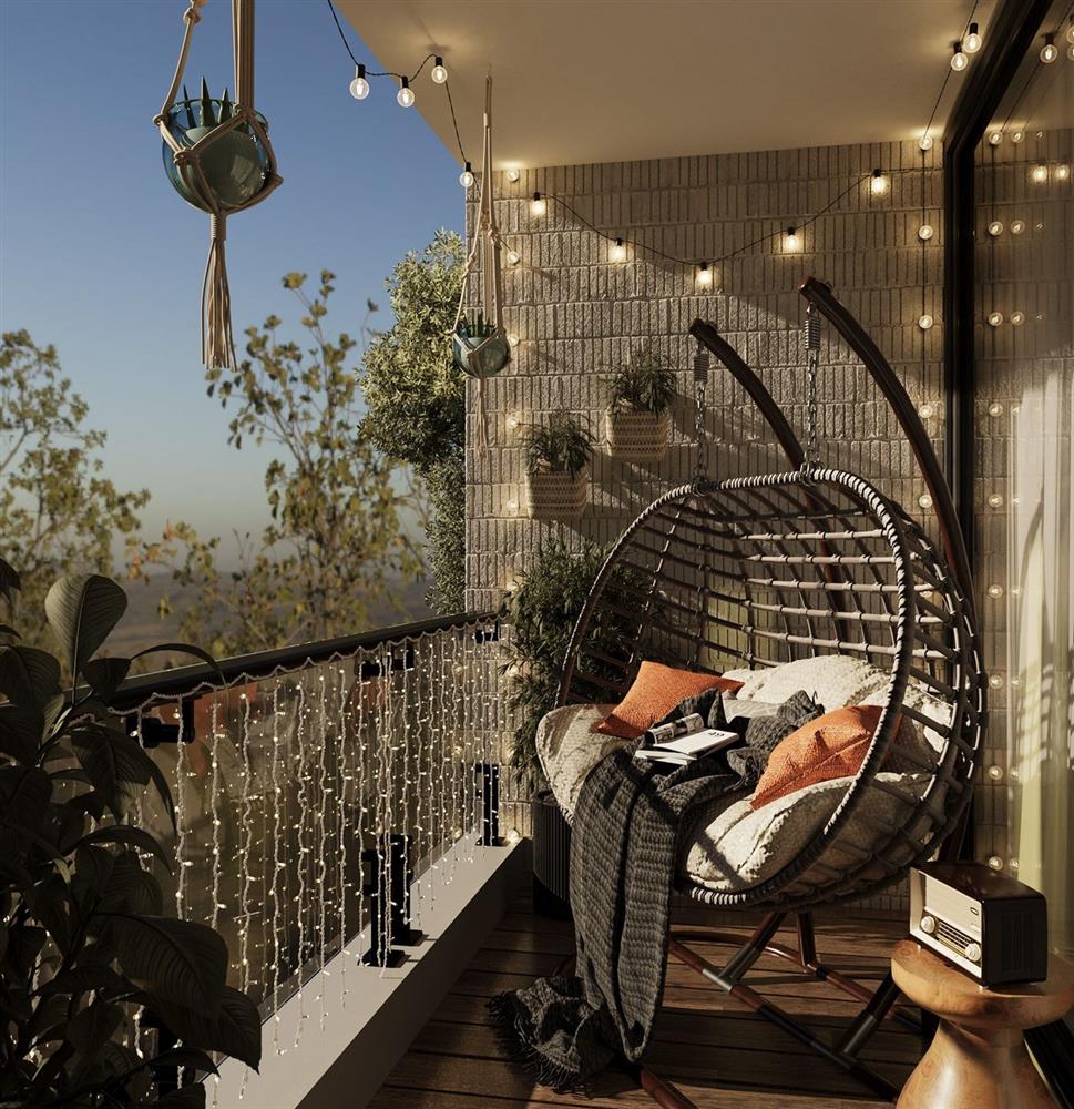 Đèn trang trí ban công không chỉ có tác dụng chiếu sáng mà còn giúp tạo không gian ấm cúng và lãng mạn vào buổi tối. Các loại đèn sử dụng năng lượng mặt trời hoặc đèn LED dây là lựa chọn lý tưởng.